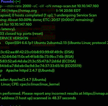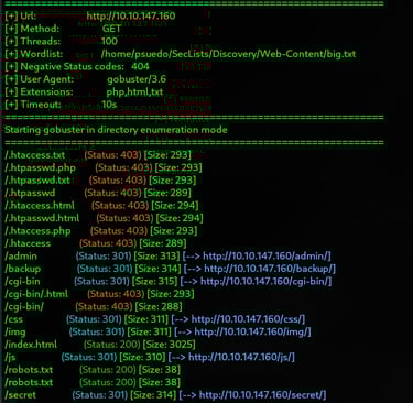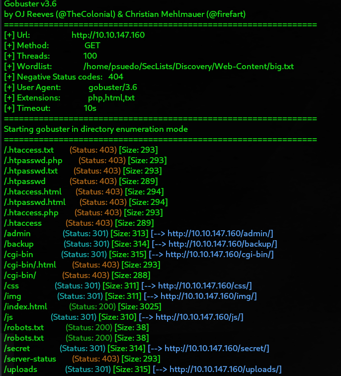 gobuster dir -u http://10.10.147.160 -w /home/psuedo/SecLists/Discovery/Web-Content/big.txt -t 100 -x php,html,txt -o gobuster-80.txt