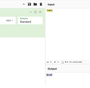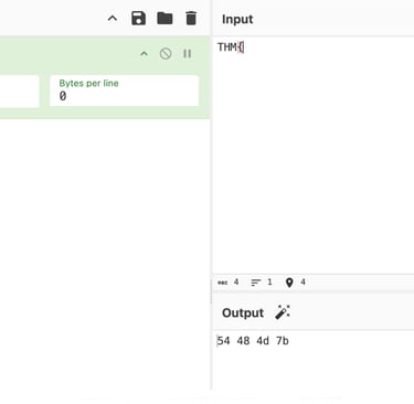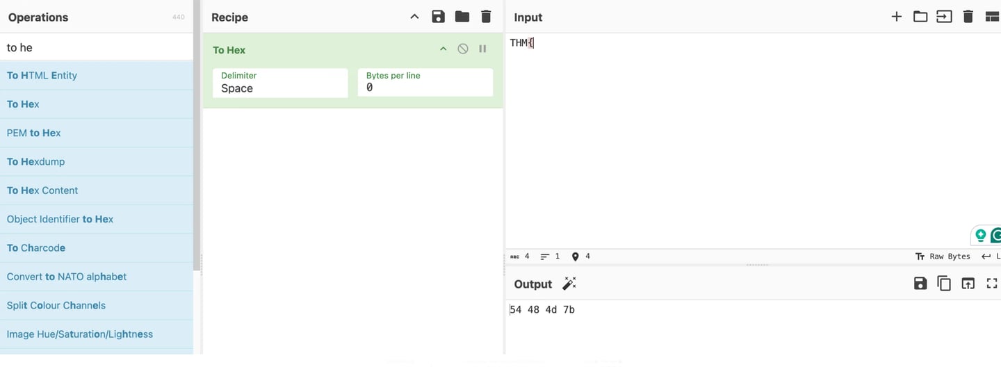 The most important lesson to learn from this is that TryHackMe consistently uses the flag format "THM{…}," thus we can be certain that the first four characters will be "THM{." In order to obtain the beginning letters of the encryption key, we can use CyberChef to first obtain the HexaDecimal counterpart of the plaintext "THM\" and then attempt to reverse the XOR operation.