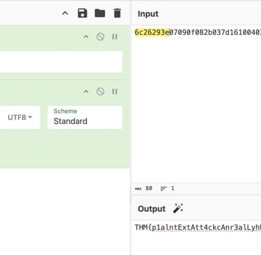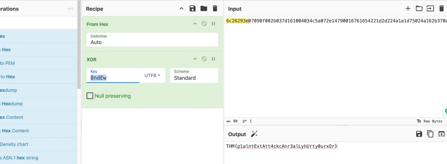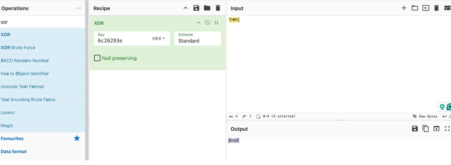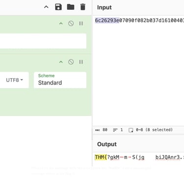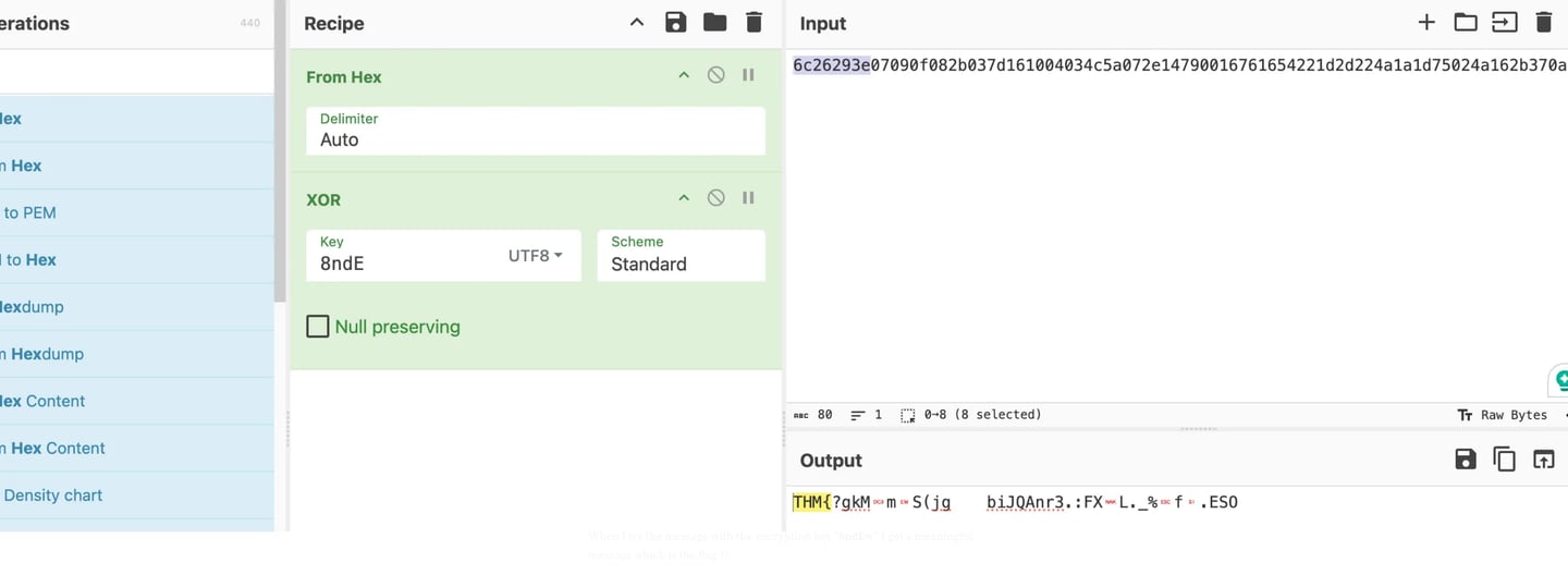 It is evident that the first four characters of the encrypted key, "THM{" and the key "6c26293e," equate to "8ndE." The original XOR text and the portion of the encrypted key that is displayed below must now be added. To reflect the reverse XORed output, I must add Hex and alter the XOR standard to UTF-8.